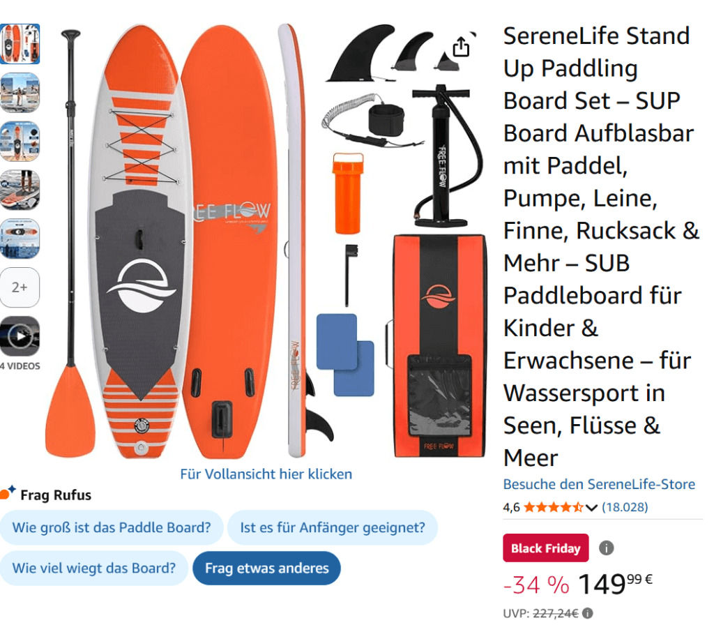 Ein SUP Board für unter 150 Euro? Da werden wir normalerweise misstrauisch. Aber die zahllosen guten Bewertungen sprechen für sich. Eventuell nutzt SereneLife den Black Friday, um nicht verkaufte SUP Boards aus dem Sommer loszuwerden. Nicht alle Modelle sind stark reduziert und der Preisunterschied teilweise sehr deutlich. In der Farbe Blau ist das SUP Board sogar nochmals 10 Euro günstiger.