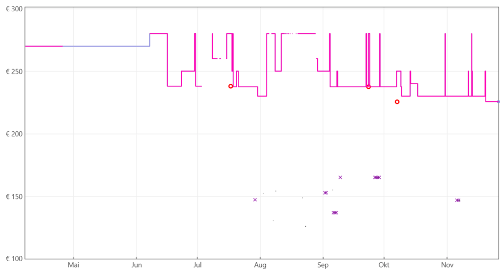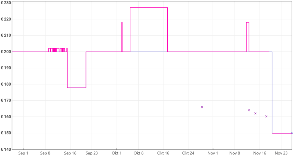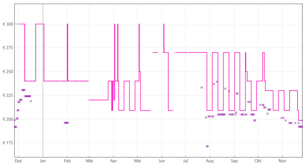 Der Preisverläuft verrät: Der Preis lag sogar im September und Oktober noch sehr stabil bei 200 Euro, die Ersparnis kann sich also sehen lassen: